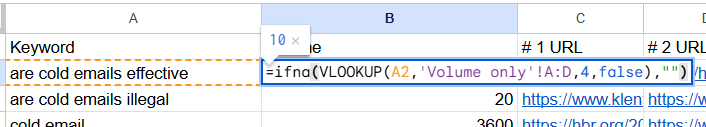 Then do a Vlookup to pull in the volume: In cell B2 put this formula: =ifna(VLOOKUP(A2,’KEYWORD_TAB’!A:D,4,false),””)