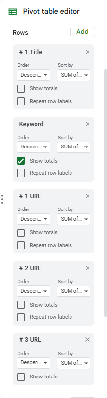 This app creates detailed content outlines from a keyword and 3 URLs. (Which is why I configured the pivot table the way I did.)