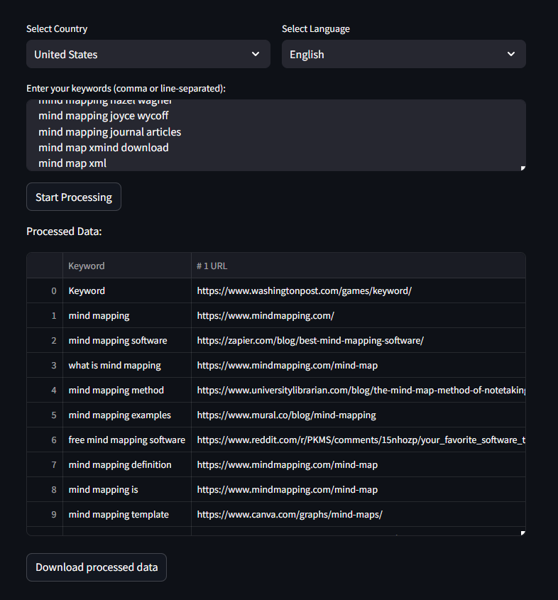 Next you’ll need to scrape the Title tag and URL of the top 10 search results for each keyword.